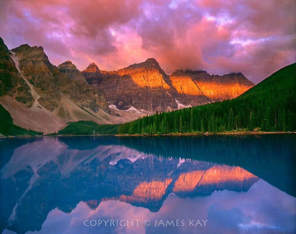 Early-morning storm clouds gather over the Wenkchemna Peaks above the calm waters of Moraine Lake in Banff National Park. Perhaps the most photographed scene in the Canadian Rockies, this sublime body of water was created by a large glacier which scoured this valley during the Pleistocene Epoch. Surrounded by country where the spectacular is ordinary, Moraine Lake stands out as a jewel among jewels here in the Valley of the Ten Peaks. As summer temperatures melt a number of small remnant glaciers in the mountains above, glacier-pulverized rock adds silt to the streams which enter this lake and causes its waters to take on a brilliant hue of turquoise. The jagged ridge of the Wenkchemna Peaks forms the continental divide in this portion of the Canadian Rockies.