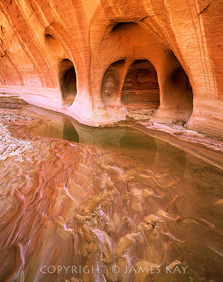 The headwaters of the Paria River gather along the eastern edge of the Paunsagunt Plateau in the Pink Cliffs below Bryce Canyon National Park. This small stream meanders south through a series of deep sandstone canyons before it empties into the Colorado River at Lees Ferry 75 miles from its source. After the winter snows melt in late spring, this stream usually dries up completely until the monsoon rains of late summer when huge flash floods often fill this narrow canyon from wall to wall. As the Paria cuts its way into the Navajo Sandstone north of its confluence with Buckskin Gulch, the erosive power of the water has sculpted numerous honeycombed alcoves along the canyon walls.